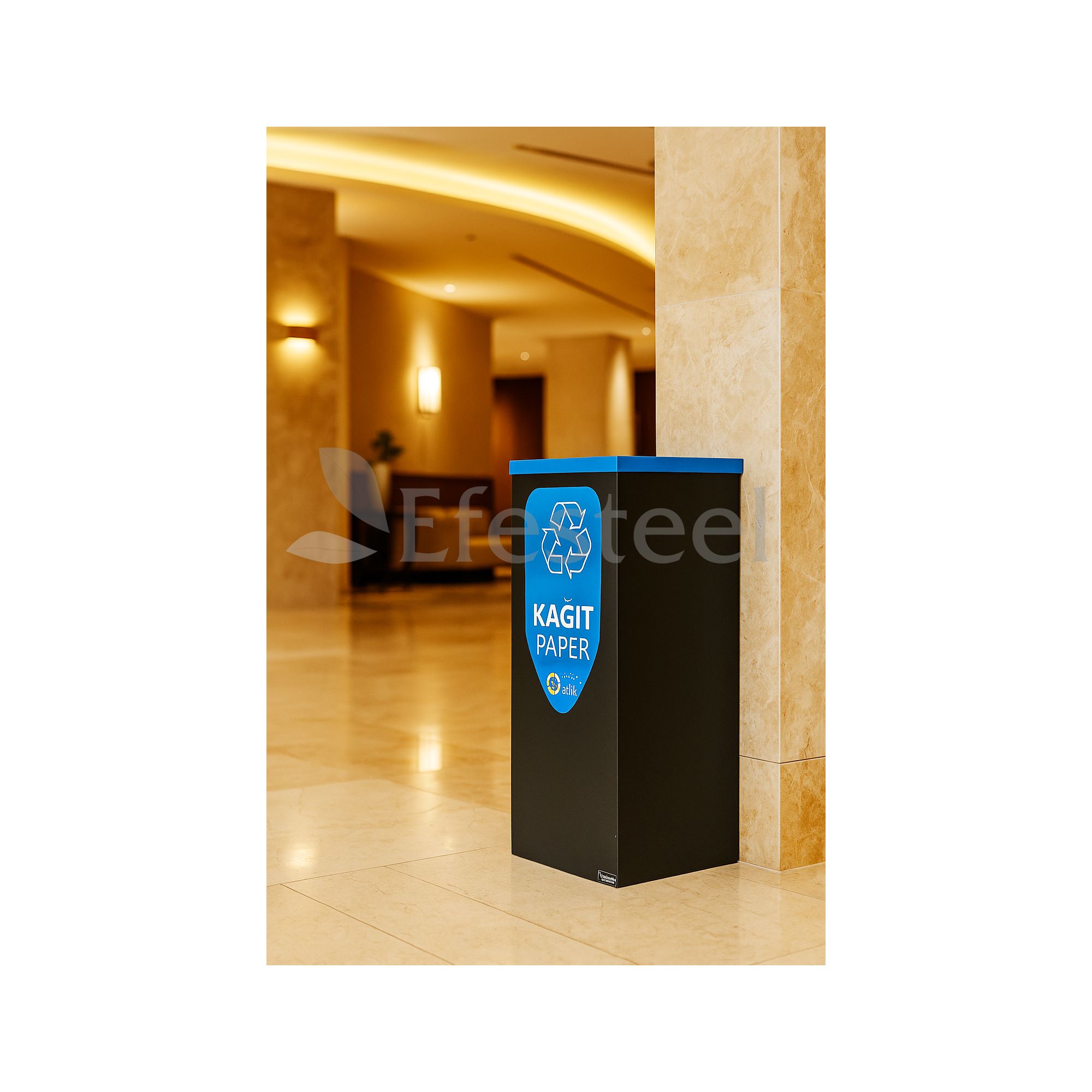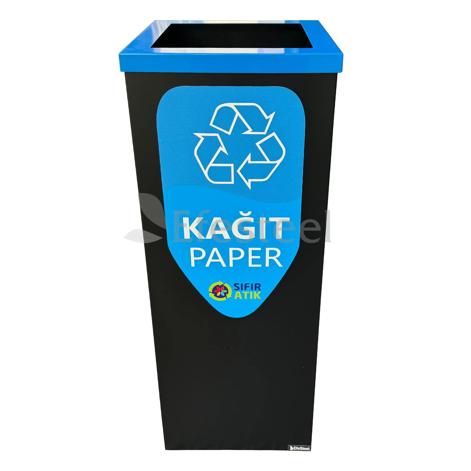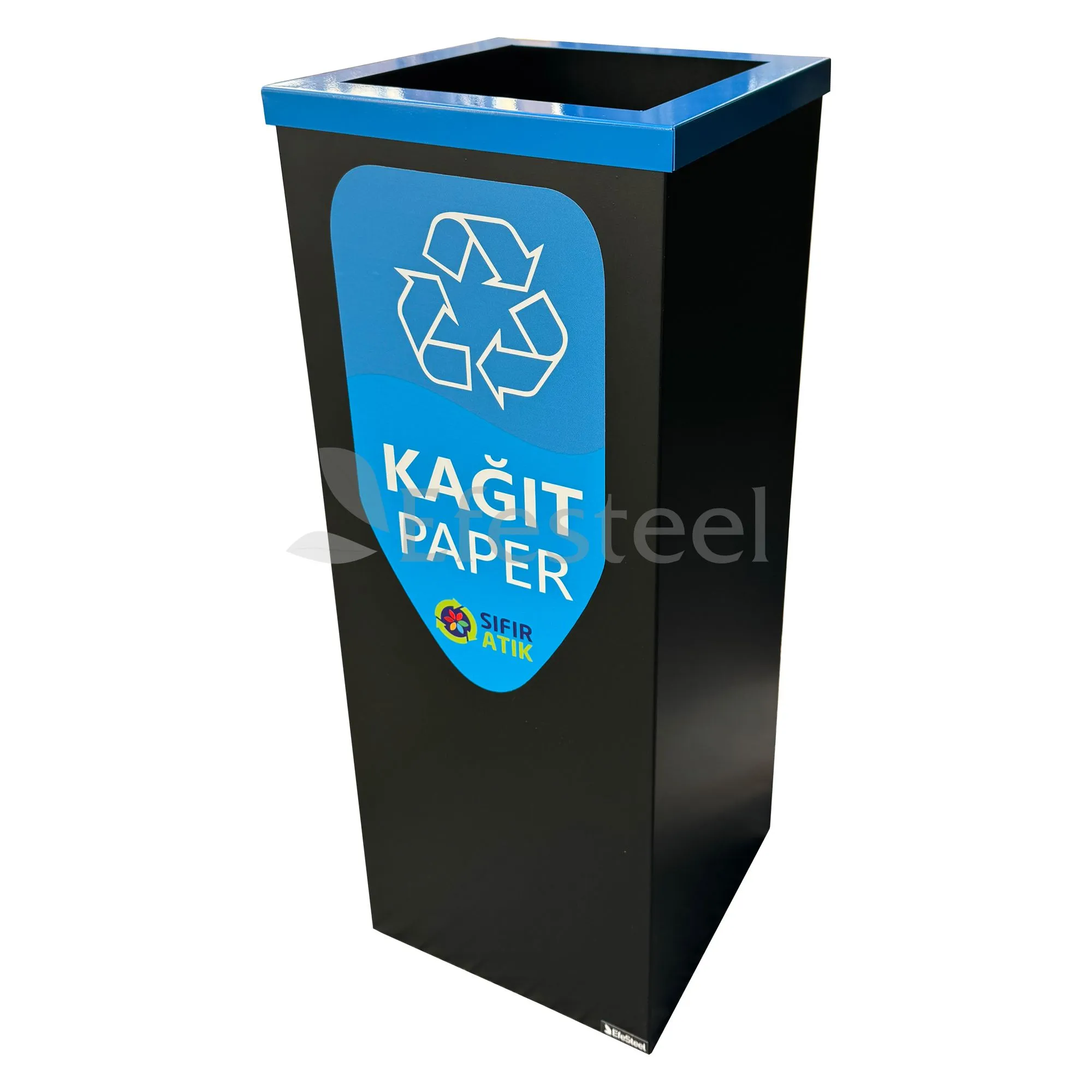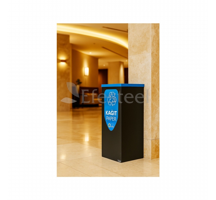 Dkp üzeri elektrostatik toz boya ile boyanmıştır. Geri dönüşüm çöp kovasının ölçüleri 25/25/65 cm. dir.