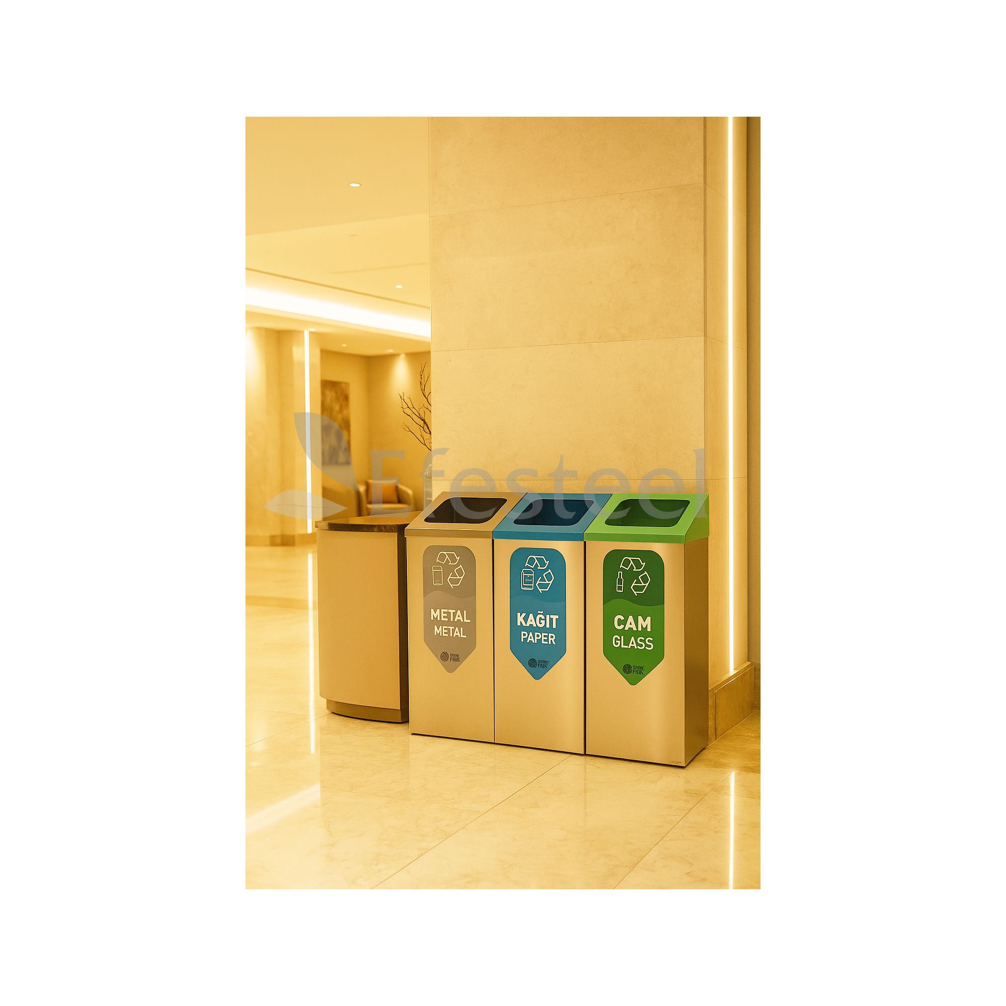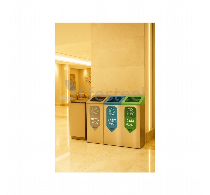 - Gri (metal), mavi (kağıt) ve yeşil (cam) renkli eğimli kapaklar geniş atım ağzı sunar; büyük geri dönüşüm simgeleri ve yazılar kullanıcıyı doğru bölmeye yönlendirir