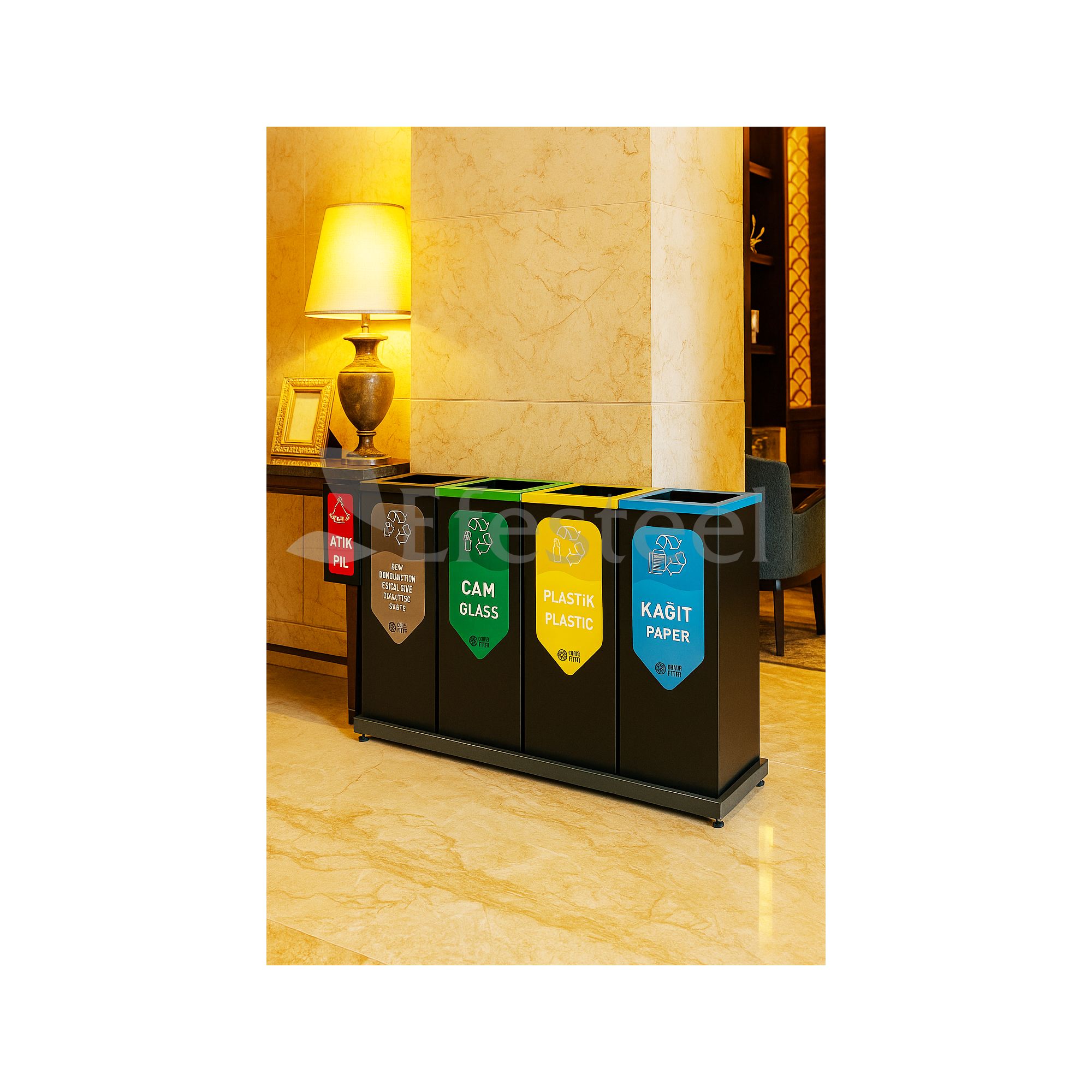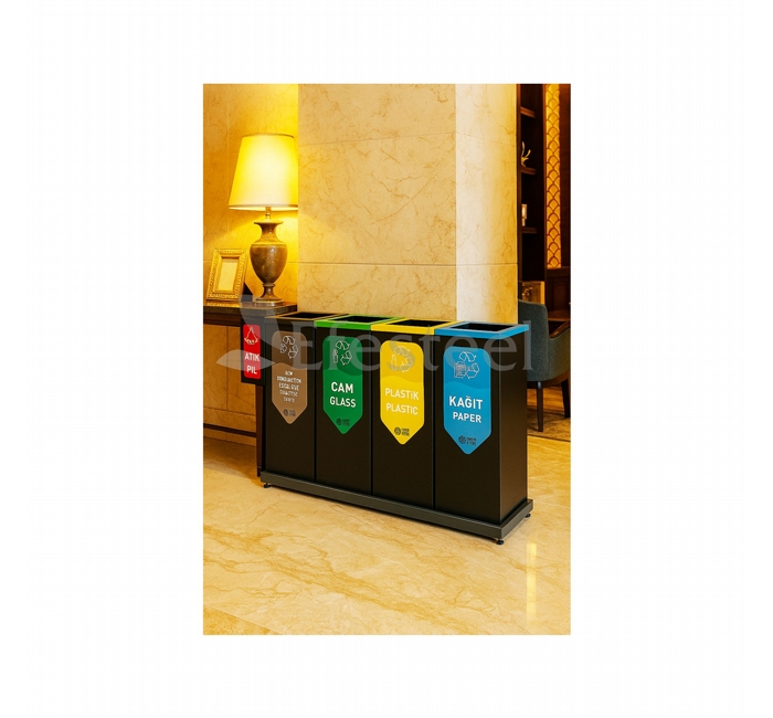 Otel, ofis, okul ve sağlık tesisleri gibi yoğun alanlarda atıkları kaynağında ayırmak için tasarlanmış, sade ve dayanıklı bir ünite. Renkle ayrıştırılmış yapı “Sıfır Atık” uygulamalarına tam uyum sağlar. Yanda konumlanan atık pil kutusu, pillerin diğer atıklardan ayrı toplanmasını kolaylaştırır.