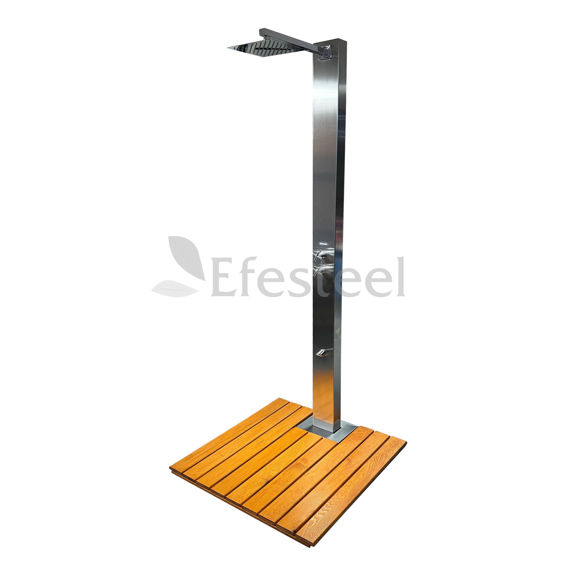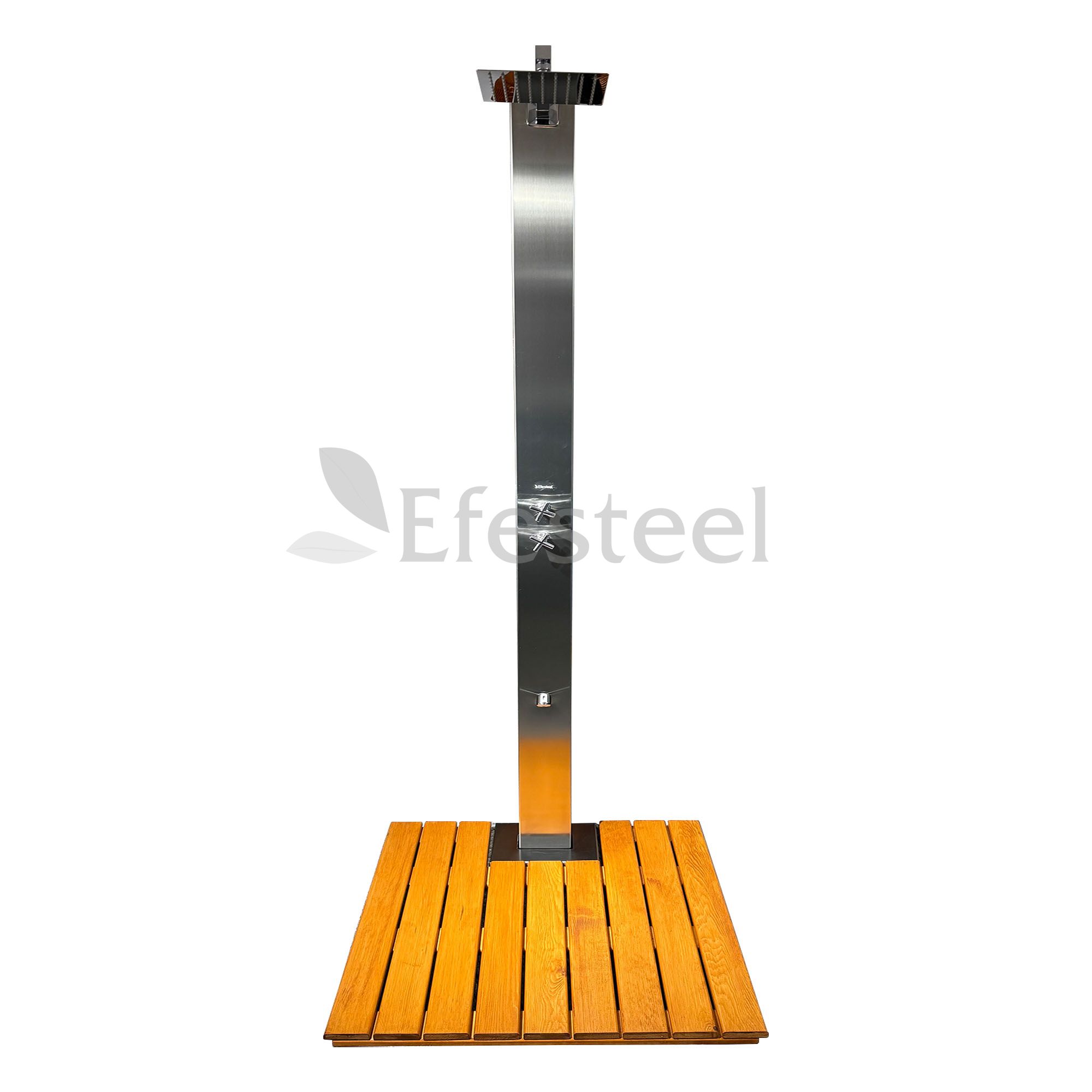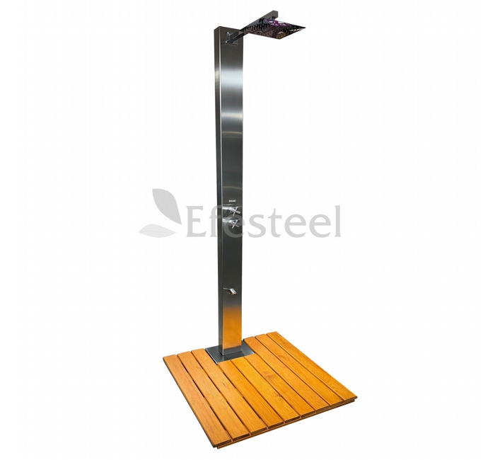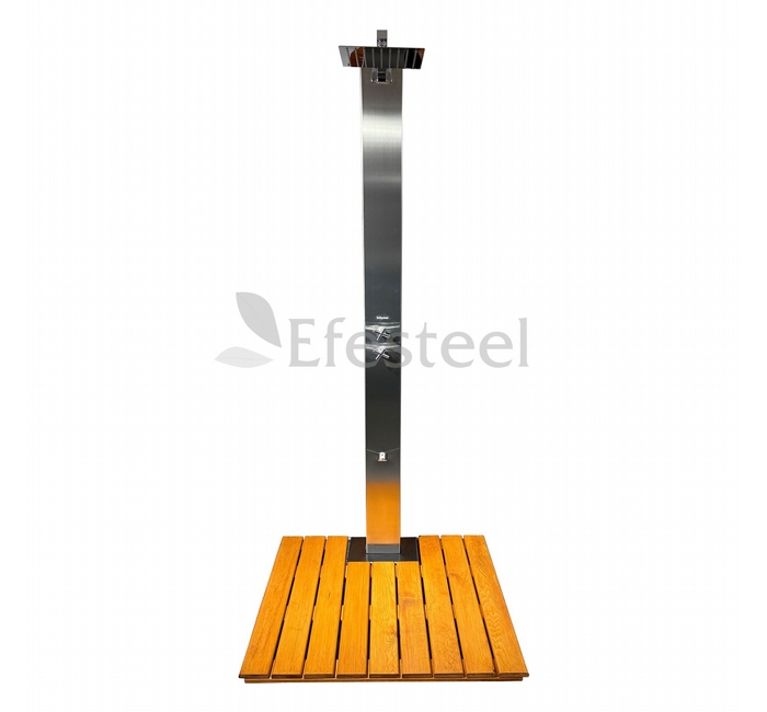 Paslanmaz Çelik Havuz Duşu – Kare Gövde, Ahşap Deck Platformlu- Ayak Yıkamalı